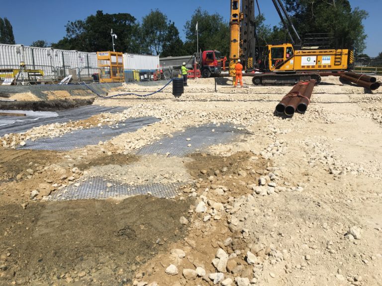 Ground improvement methods for working platforms can be very expensive especially over weak and variable ground conditions. We offer an effective solution for improving ground conditions and provides safe working platforms for rigs, heavy construction machinery, and loaded areas. Our geogrid interlocks with the well-graded granular fills resulting in a mechanically stabilized layer that improves the overall soil matrix. This allows heavier static loads from cranes and heavy machinery to be carried and limit ground movement beneath heavy loads.